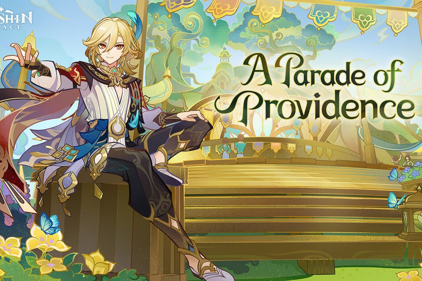 Get Genshin Impact’s Faruzan free in 3.6 Parade of Providence event: anime man with blonde hair sitting next to text title